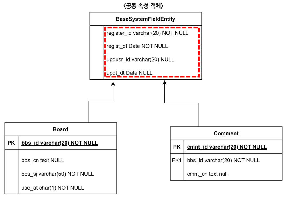 위 이미지는 Board와 Comment라는 두개의 Entity 사이에서 공통적으로 사용되는 속성 객체를 BaseSystemFieldEntity라는 부모로 사용하는 구조를 표현하였습니다.